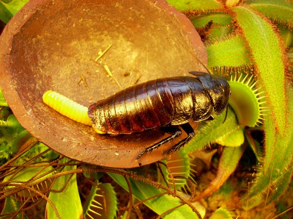 Some may think of roaches as gross, disease carrying pests but they are very important parts of a healthy forest because they are decomposers. Roaches eat decaying organic material–primarily vegetation–and process it into waste that is usable fertilizer for forest plants. They are also food items for many creatures such as lizards, toads, frogs, snakes, birds, mammals and in some regions even people! Only a few species of roach are pests to humans and luckily the Madagascar Hissing Cockroach is not one of them. Isn’t nature amazing!!