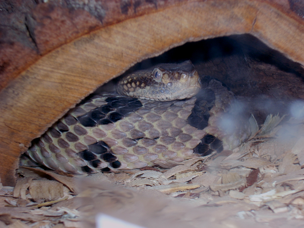 And here is Gandalf the Canebrake rattlesnake resting under his log.  (sorry about the dirty glass.)