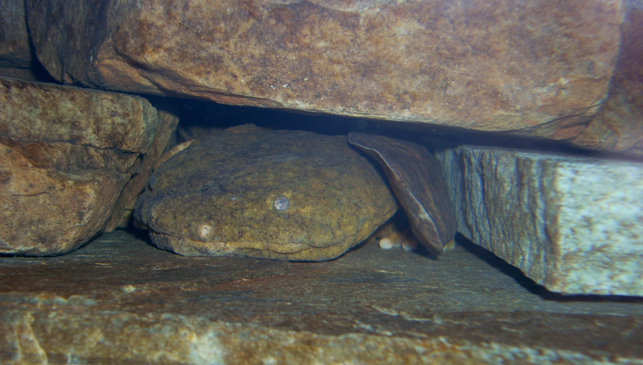 Finally there is Gollum the Eastern Hellbender who is squeezed into his favorite notch in the rocks.  It looks like his is uncomfortable but Hellbenders love to jam themselves in tight crevices–it makes them feel secure.