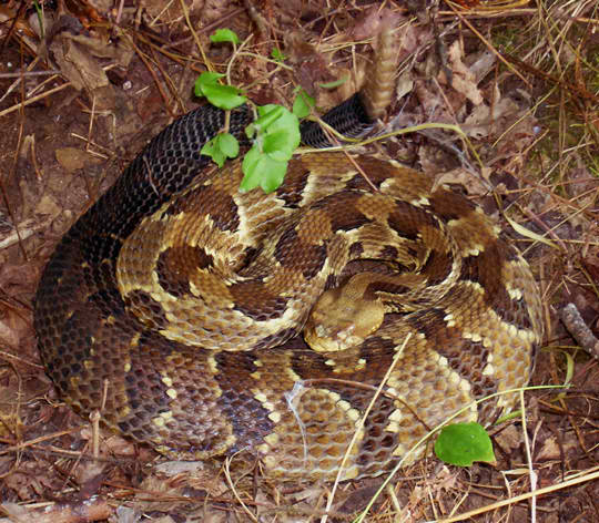 Zoe, the female Timber rattlesnake that we are radio tracking, is out of hibernation and on the move! I discovered that she had moved from her over-wintering site when I journeyed into the woods yesterday evening for my weekly data collecting trip to their locations. I visited Utsanati’s (the male) site first only to find him still underground in his den. I then made my way upslope through the budding blueberries to where Zoe has been since November of 2011. As I made my way up the steep mountainside I began to realize that the signal from her transmitter seemed different and I started to wonder is she had moved. When I arrived at her den site–a dead snag surrounded by its fallen rotting limbs–I confirmed that she had in fact moved and that the signal was strongest to the south so I made my way in her direction. As I made my way up the mountain the wind picked up and a light rain began to fall so I moved as fast as possible but still with enough care because I was looking for a rattlesnake! Soon I arrived at the source of her signal–the same rotting stump that she had taken refuge in for several days last fall! Interestingly, she had backtracked from her winter den site where she has slept for over four months to this refuge that she had used just before going into hibernation. Why was she here? Only she knows for sure but I believe that she is making her way up hill from the cooler north side of the mountain where she spent the winter to the warmer southeastern slopes of the mountain where she can more effectively thermoregulate. I was unable to see Zoe because she was holed up underground but at least I now know that she made it through hibernation. Hopefully soon I will find her out basking on the surface and I will be able to get some photos and video of her condition. Until then below is a photo of Zoe from last fall before she went into hibernation.