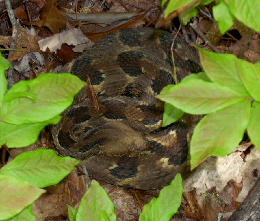 Utsanati has moved from his remote location in the forest and is back at his capture location near Earthshine! It has not even been a full year since I first discovered him and during that time he has traveled deep into a distant cove to hibernate and then come full circle to almost the exact location where I discovered him! His reasons for coming back to the area of his capture to me is obvious–food. The forest in the area is full of rodents and on top of that there are lots of great thermoregulation spots in the form of old metal roofing, rocks and logs to shelter and hunt under. I have no doubt that Utsanati remembers being captured at this sight but his need for food outweighs his fear of man. This is very good information indeed so I rate his presence at this location as a Danger Level 3. Can you find Utsanati in the photo below?