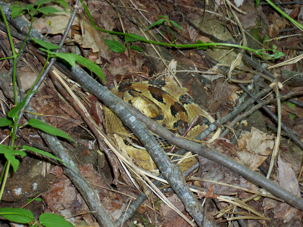 Rattlesnake Report #3 for 5/6 2012. In these special blog postings I will update you on the movements and status of Timber Rattlesnakes Utsanati and Zoe that we are following with radio telemetry. I have come up with a “potential danger level” scale that represents the potential danger the snakes could pose to the human inhabitants of the community due to their proximity to human habitations and activity areas. The danger level also applies to the snakes being in danger if they are near a road or yard where they could be accidentally injured or killed or by man and his machines and toxic chemicals such as insecticides and herbicides. If you live in the community where the snakes live please pay close attention to their locations and the “potential danger level” and take appropriate care in your activities to protect you and the snakes from any harm. The scale will be as follows: Danger Level 1= No immediate danger. The snake is in the rough. Danger Level 5=High danger level. The snake is very close to a residence/trail/road–walk, drive or mow carefully and please do not spray toxic chemicals in the area where the snake was last found. If you have questions about the snake’s locations please do not hesitate to contact me.