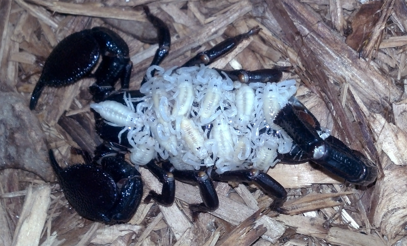 We have had an amazing event over the weekend–our Imperial Scorpion “Fluffy” is now a mother! Check out the photos of mama and babies below!