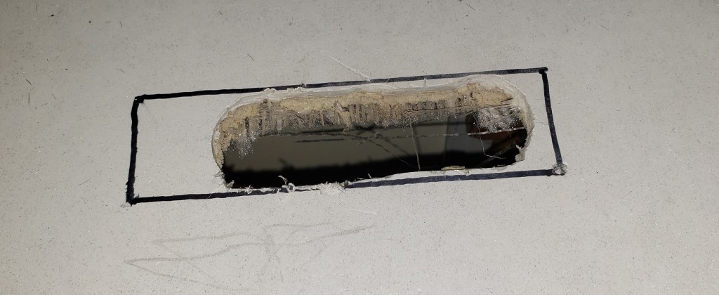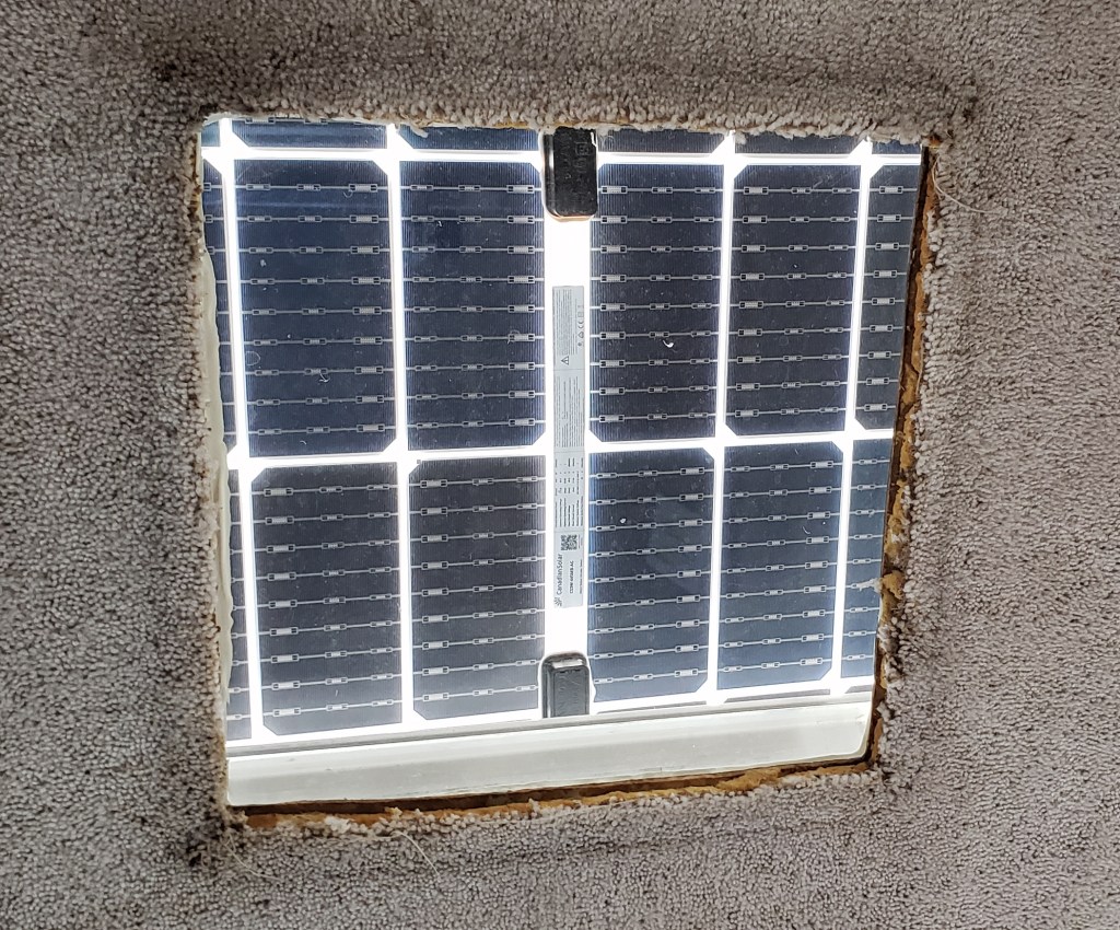 Before the modules could be installed we needed to prep the PoD’s roof to receive the solar array so we could install the pass-thru for the solar wiring. This is a photo of the huge hole we had to cut in the PoD’s perfectly good fiberglass roof…