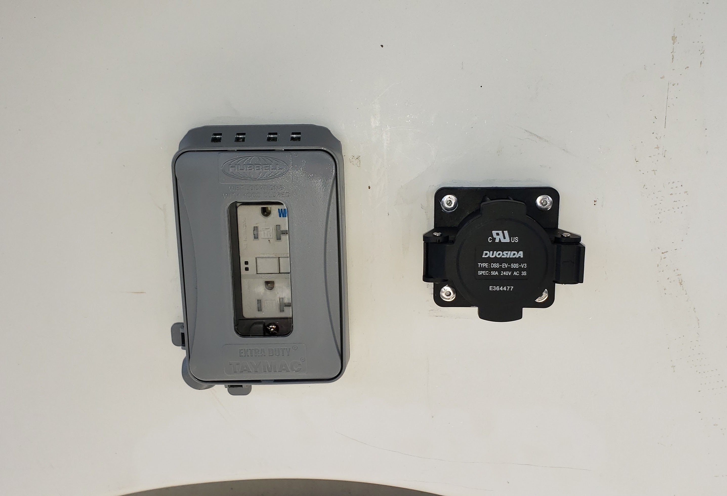We also installed a J-1772 inlet charge port – it is the black device to the right of the outdoor power outlet in the next set of photos. This device will allow us to charge the PoD’s lithium-ion batteries via any Level 2 Electric Vehicle Supply Equipment (EVSE) aka charger such as the one at my home, the one at the ENP/Trails classroom, or anywhere on the road using other J-1772 units and even Tesla Destination EVSE units (by using an adapter). This will be very useful when we are on the road and/or during long periods of rain when our solar modules are unable to keep our batteries full. The 120-volt power outlet will be used to power the monitor, microscope station, and any electric vehicle that possesses a J-1772 charge port (most of them) and/or that has the correct adapter.