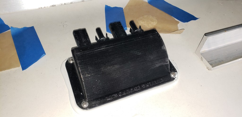 We then installed the 3D printed entry gland over the hole – this device will allow the solar wiring to pass through from the roof to the solar-electronics cabinet directly below.