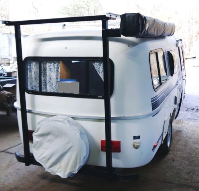 The awning is in the black bag hanging on the right side of the rack – I will try to find a day soon when I will deploy it and get some photos to share with you.