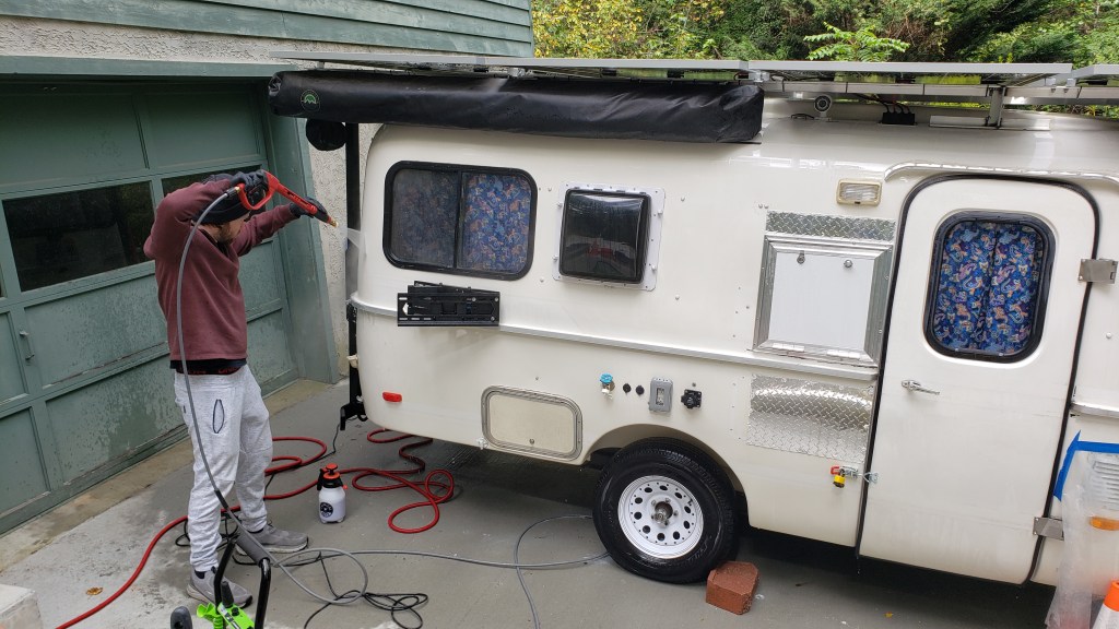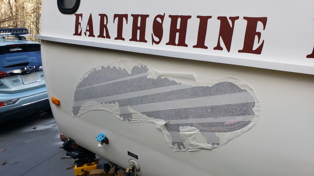 Between events, the time came to remove the old Casita decals and clean the PoD as well as possible before applying the custom new ENP decals. This is how the PoD looked before decal removal and cleaning.