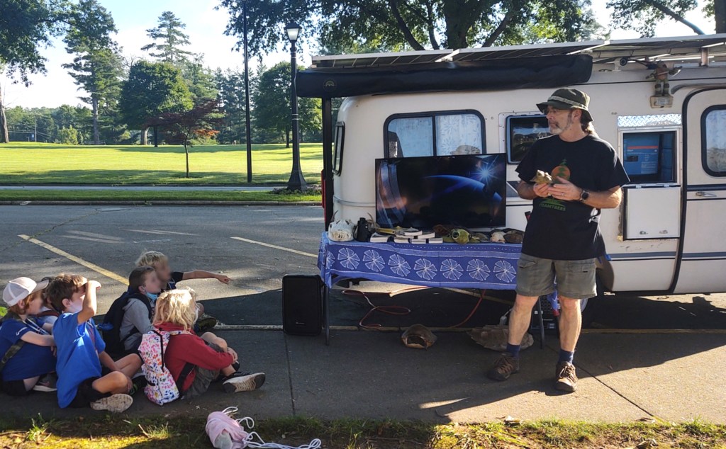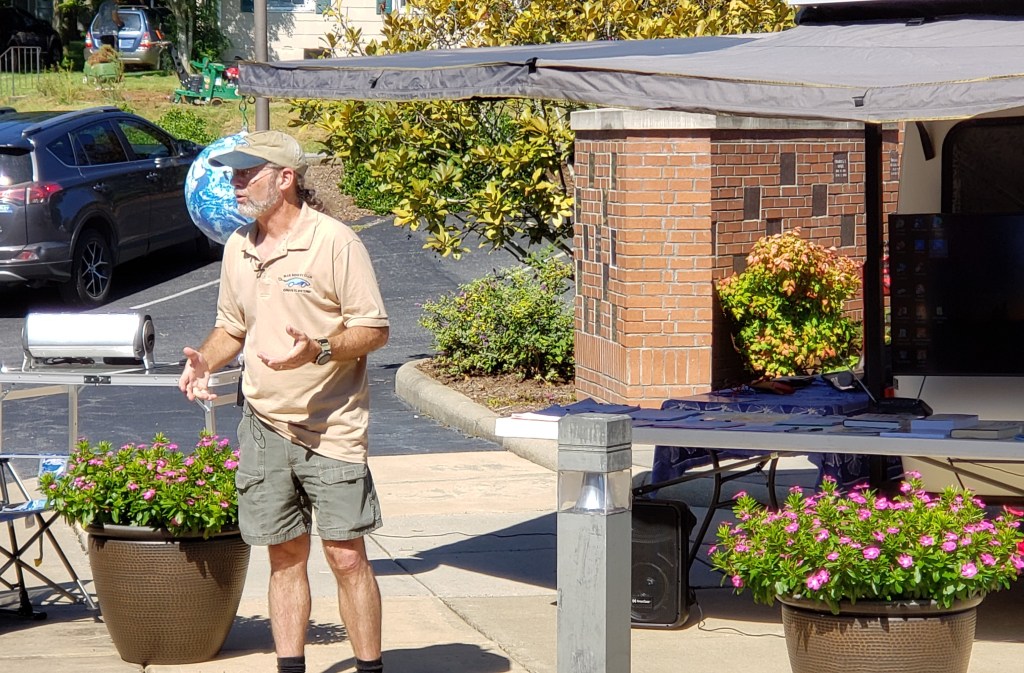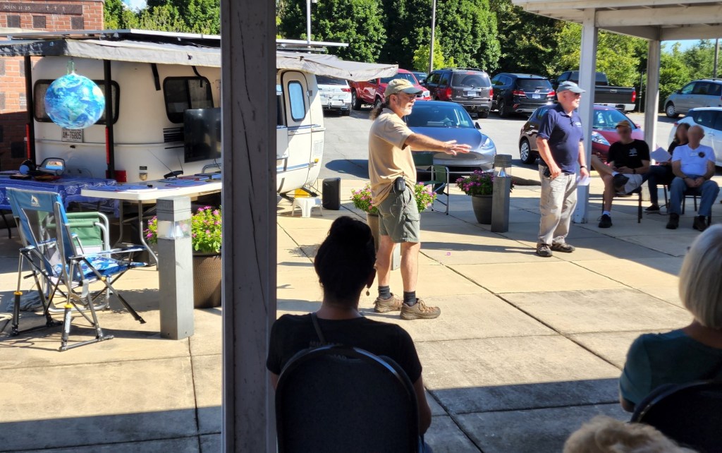 Then, we presented several more programs – one was at the Blue Ridge Electric Vehicle Club’s semi-annual National Drive Electric Week electric vehicle car show where the PoD and Mighty Bolt EV took center stage. The club used the PoD’s PA system to emcee the event. This is what our display looked like before the event opened to the public – the Mighty Bolt EV is plugged in and changing from the PoD’s 1,780-watt rooftop solar array – so cool!