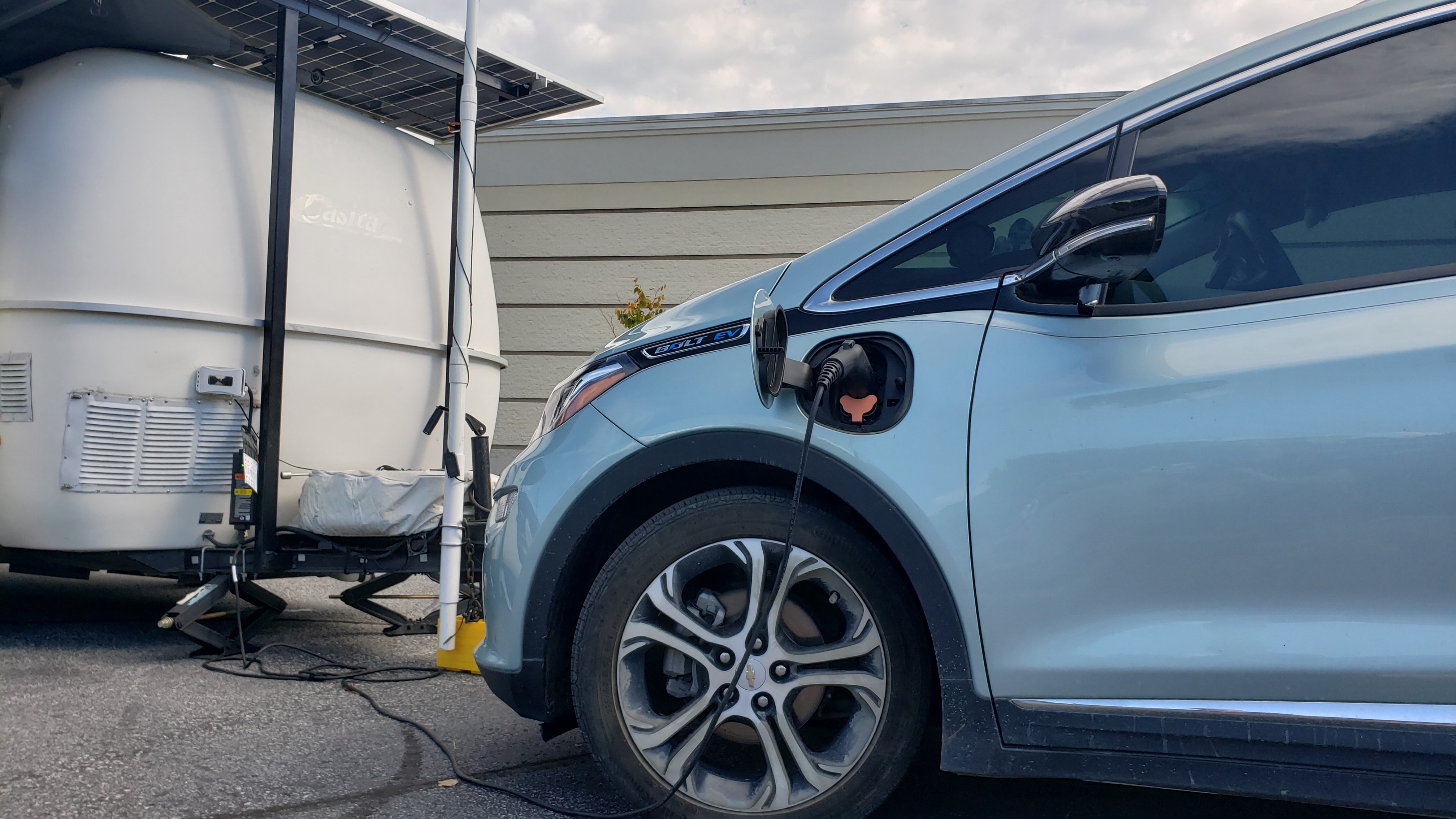 While Jim and I were presenting the program I arranged with Marian to drive up in the “Mighty” Bolt EV, park adjacent to the PoD in full view of the audience, then nonchalantly plug the EV into the PoD to charge its batteries on solar-generated electricity, and then take a seat in the audience. It was a really neat demonstration of renewable energy and EVs in action.