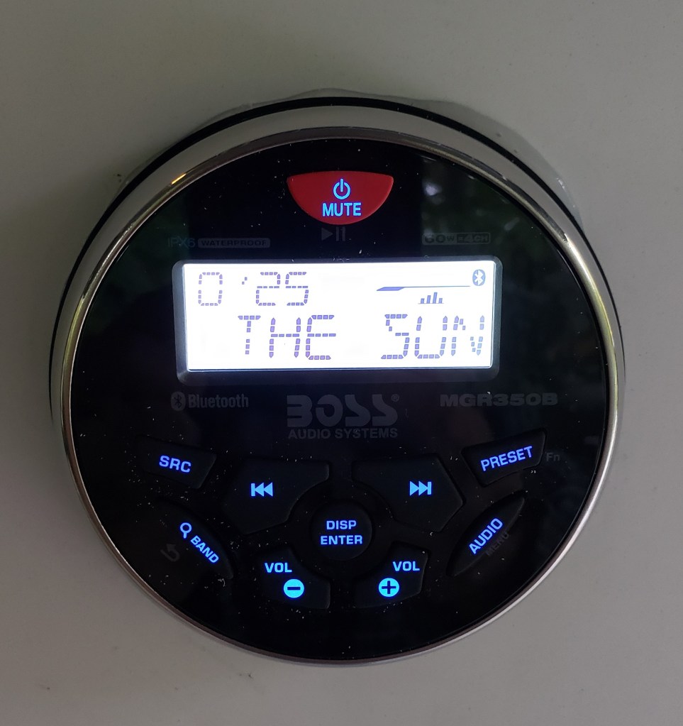 After the decals were removed and while we were waiting for the new ones to be printed, I installed a permanently-mounted weatherproof, Bluetooth-connected, sound system for use with general class programming and/or to provide background music.