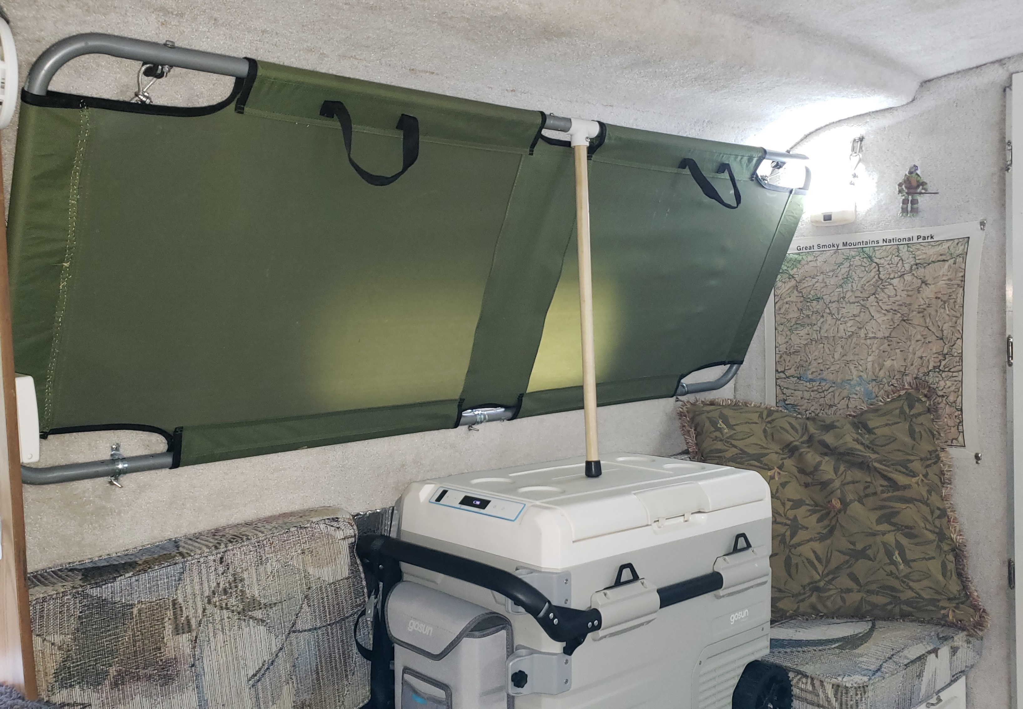 Below the cot is the GoSun Chillest 12-volt refrigerator/freezer/dinette table.