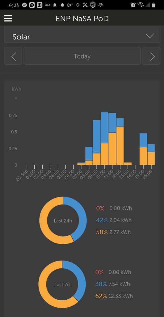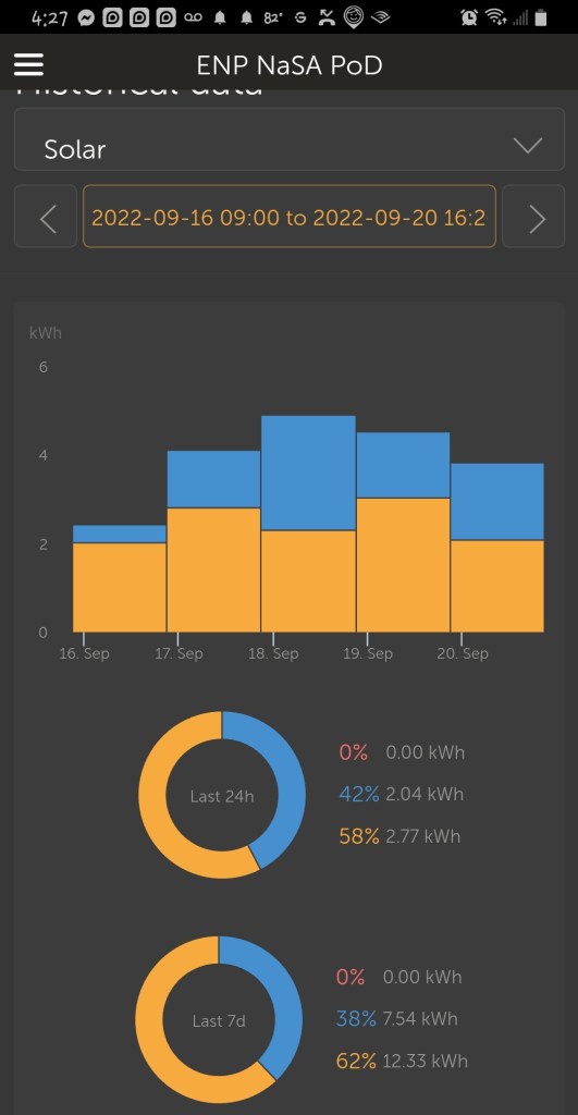 The leftmost capture shows the solar (yellow) and battery use (blue) over 5 days of the PoD’s stay at CW.