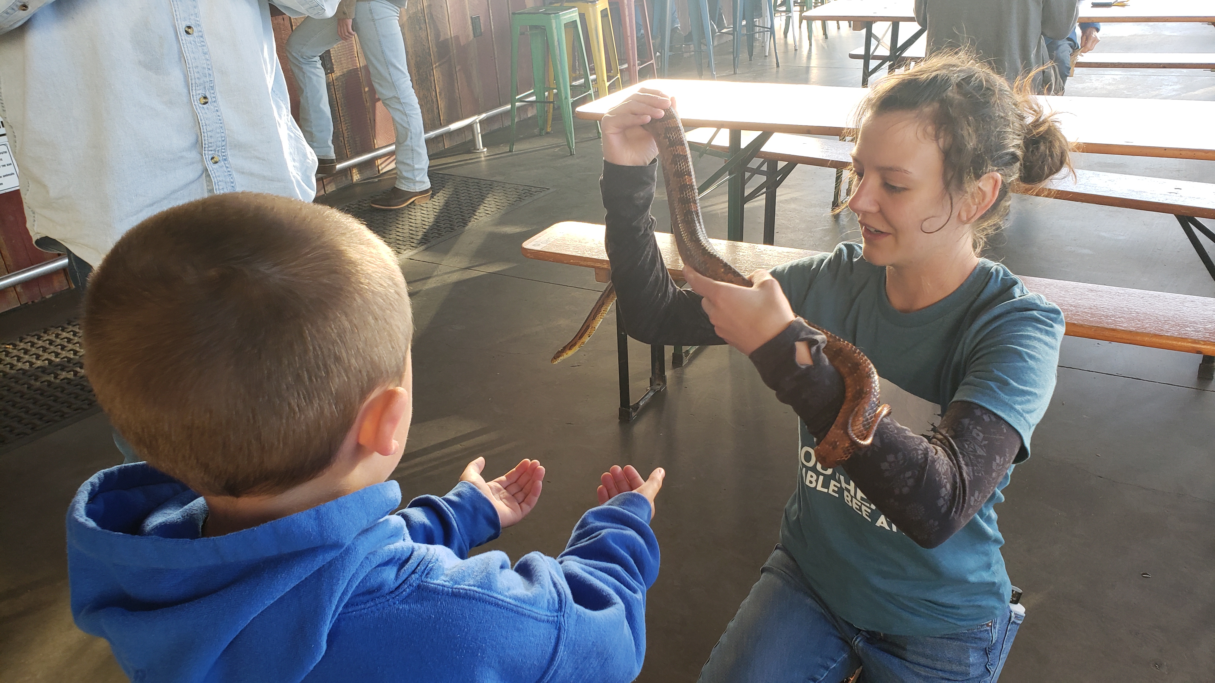 Wonderful long-time ENP volunteer extraordinaire Paulina sharing one of our friendly reptilian ambassadors – Elongated Muskadine – with a young friend.
