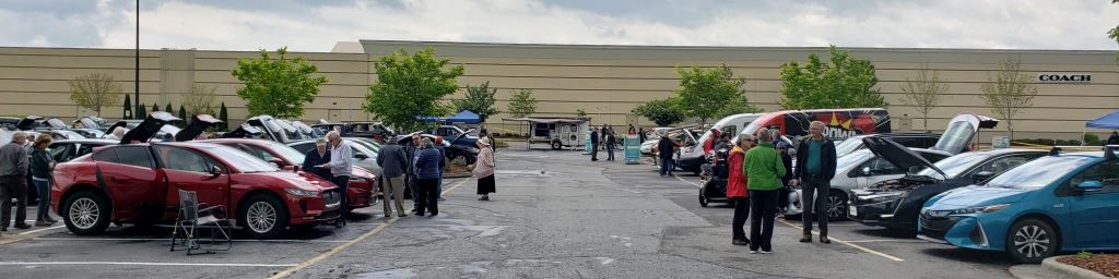 At the Drive Electric Earth Day event, over 70 EVs of various makes and models were in attendance. We had a steady flow of people interested in learning about driving electric and it was a grand success! Look in the center distance for The PoD – its micro-grid provided solar-sourced electricity to run the PA/sound system during the event and charge a participant’s EV – so cool!